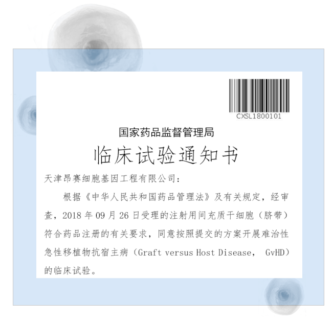 2025年11月3日, 天津昂賽細(xì)胞基因工程有限公司申報的注射用間充質(zhì)干細(xì)胞(臍帶)治療難治性急性移植物抗宿主病(aGvHD)兒童患者的適應(yīng)癥獲得國家藥品監(jiān)督管理局臨床試驗?zāi)驹S可
